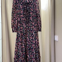 Långärmad maxiklänning med ett blommigt mönster i svart, beige och röda toner. Klänningen har en rund halsringning och en avslappnad passform. Perfekt för både vardag och fest.