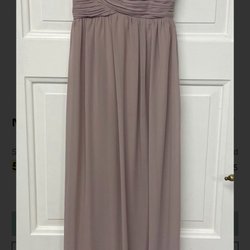 Långklänning i lila nyans med långa ärmar. Klänningen har en hög krage med en liten nyckelhålsdetalj framtill. Midjan är markerad med en draperad detalj som ger en smickrande silhuett. Ärmarna avslutas med manschetter.