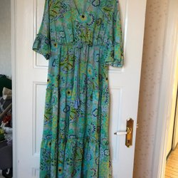 Långklänning med blommigt mönster i grönt, blått och orange. Klänningen har en v-ringning med volanger.