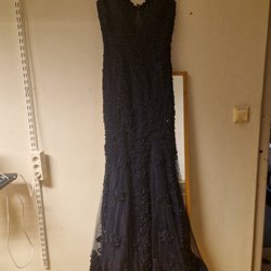 Elegant klänning med en vacker, detaljerad överdel och en böljande kjol med en elegant drapering. Klänningen har smala axelband och en figurnära silhuett. Ord.pris 5000kr