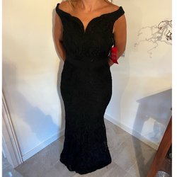En vacker röd klänning med spetsdetaljer och utsmyckningar. Klänningen har en figursydd passform och släp. Den har en öppen rygg. Storlek 34-36