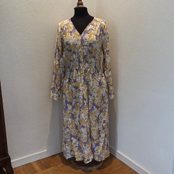 Gul klänning med ett svart blommönster. Klänningen har korta ärmar och en resår i midjan. Framsidan har veckade detaljer.