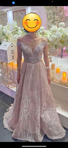 Elegant aftonklänning med en smickrande off-shoulder-design och en djup V-ringning. Klänningen är utsmyckad med intrikata silverfärgade pärlbroderier över hela överdelen och kjolen, vilket skapar ett glittrande mönster. Midjan markeras av ett smalt band med matchande pärlor. Kjolen är vid och faller vackert, med ett genomgående mönster av glittrande detaljer som ger en lyxig känsla.