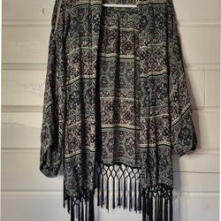 Lång klänning med paisleymönster i gröna och orangea nyanser, med tunna axelband. Bilderna för måtten är från en annan likadan klänning därav en annan färg. Storlek xs/s. Längd ca 106 cm från under ärmen.