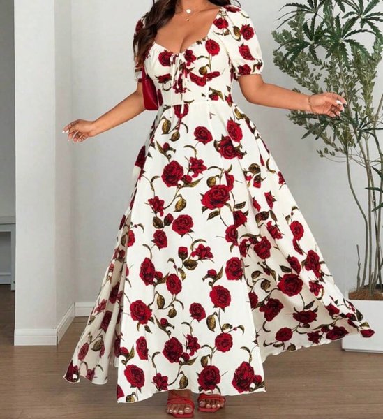 Långklänning med puffärm och rosmönster. Klänningen har en smickrande passform med en markerad midja och en utsvängd kjol som faller elegant. Urringningen är hjärtformad med en knytning framtill.