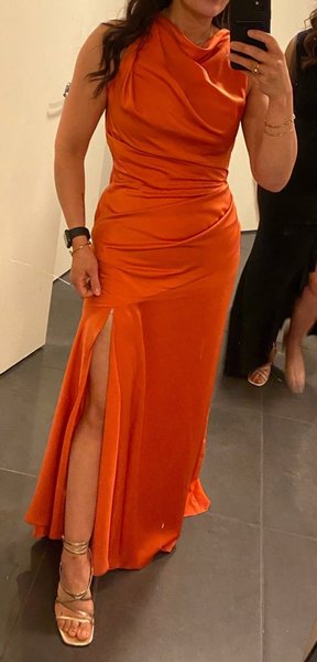 Elegant, orange aftonklänning med drapering upptill och en hög slits på sidan. Klänningen har en smickrande silhuett.