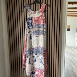 Lång klänning med v-ringning och tofsar framtill. Klänningen har en lös passform och ärmlös design. Mönstret är i nyanser av rosa, rött och vitt.