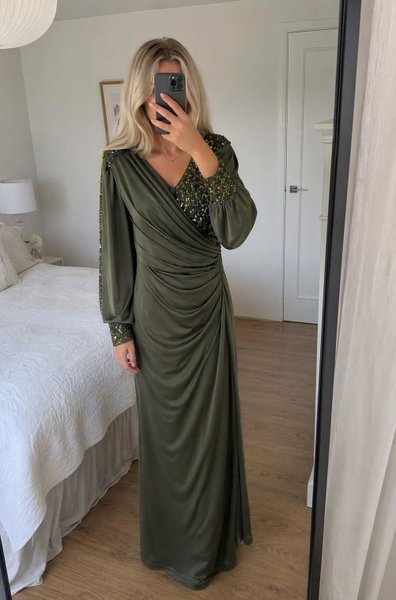 Långklänning i en elegant omlottdesign med draperade detaljer som skapar en smickrande silhuett. Klänningen har långa ärmar med puffdetaljer vid axlarna och manschetter. Överdelen och ärmsluten är prydda med paljetter som ger en festlig touch. Klänningen har en V-ringning.