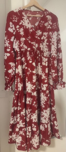 Klänning med långa ärmar och ett blommigt mönster i vitt mot en röd bakgrund. Klänningen har en omlottringning och resår i midjan. Ärmsluten är volangprydda och kjolen har volanger i flera nivåer.