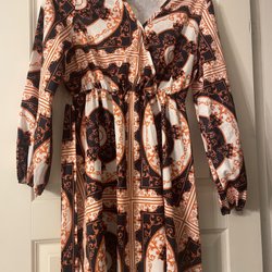 Färgglad klänning med långa ärmar och resår i midjan. Klänningen har en v-ringning med knytband och en volang nedtill.