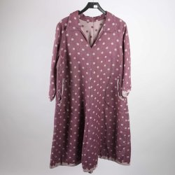 Vinröd klänning med lång ärm och volang nedtill och vid halsen.