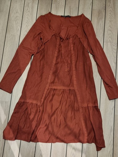 Rostbrun klänning med långa ärmar och snörning i halsen. Klänningen har fina spetsdetaljer. Mjuk och behaglig på med ett fint fall. Ursnygg som en bohoo klänning. Har legat i en låda. Tvättas och strykes vid avslutad auktion. Strl M. Ej använd.
