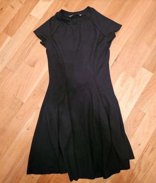 Svart klänning med kort ärm och rund hals. Klänningen har en figurnära passform upptill och en utsvängd kjol.