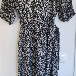 Svart och vit mönstrad klänning med knytband i midjan och trekvartsärmar.