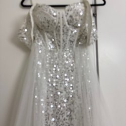 Vit klänning med spetts, tyll och skimrande detaljer i midjan. Underkjol av tyll. Stretch-material i överdel. Knä-lång. Bara använd några gånger.