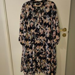 Klänning med blommigt tryck upptill och svart kjol nedtill. Klänningen har en avslappnad passform. Bystmått ca 41cm och längd ca 84cm