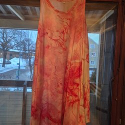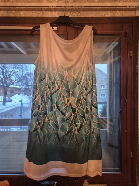 Ärmlös klänning med ett bladmotiv i blå nyanser som tonar nedåt. Klänningen har en ljusare överdel och en ljus kant nedtil