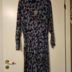 Blå klänning med ett mönster av cirklar. Klänningen har långa ärmar och en v-ringning.