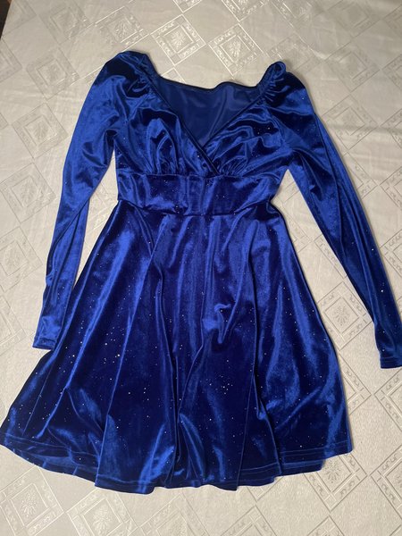 Klänning i en djupblå nyans med långa ärmar och en v-ringad omlottdesign. Klänningen har en markerad midja och en utsvängd kjol som faller elegant. Hela plagget är prytt med små, glittrande detaljer som ger en stjärnklar effekt.