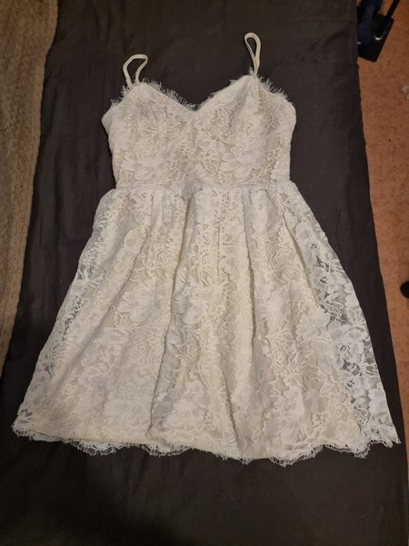 Vit spetsklänning med smala axelband och V-ringning. Klänningen har en figurnära överdel och en utsvängd kjol med veck. Spetsmönstret täcker hela klänningen och har en scalloped kant vid fållen.