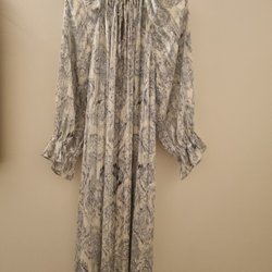 Klänning med blommigt mönster i vitt och blått. Klänningen har korta ärmar och en dragkedja baktill. Midjan kan justeras med ett knytband för en anpassad passform. Klänningen är 101 cm lång och 40 cm bred i midjan.