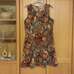 Klänning med ett färgglatt blommönster över hela plagget. Klänningen har korta ärmar och en rundad halsringning.