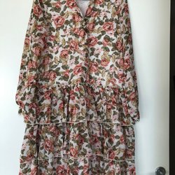 Vit klänning med volanger på ärmarna och resår i midjan. Klänningen har en rund halsringning och är i en lätt och luftig modell.