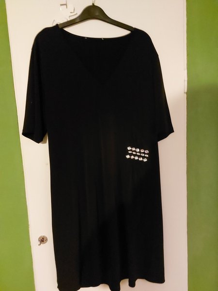 Mkt fin svart klänning med kort ärm och V-ringning. Klänningen har dekorativa stenar på ena sidan framtill.