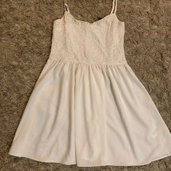 Söt, smickrande klänning med spaghettiband och resår i midjan. Klänningen har ett vackert tryck med stora blad.