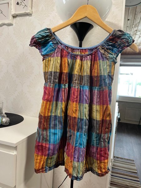 Färgglad klänning med ett rutigt mönster i olika nyanser. Klänningen har en rund halsringning och korta, rynkade ärmar. Den är avskuren i midjan och har en lätt utställd kjol.