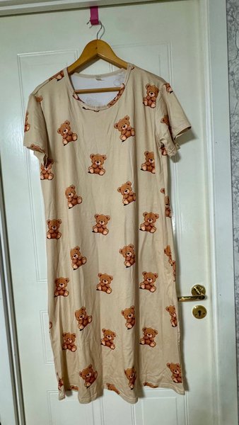 Söt klänning med ett mönster av nallar. Klänningen har korta ärmar och en rund halsringning. Använd 1 gång.