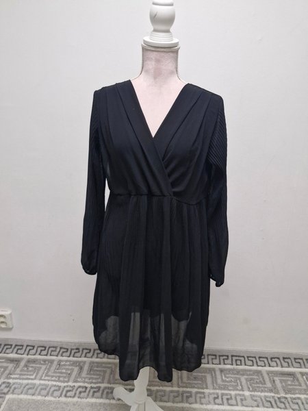Elegant svart klänning med långa ärmar. Ärmarna och kjoldelen har fina plisserade detaljer som ger en fin textur och rörelse.