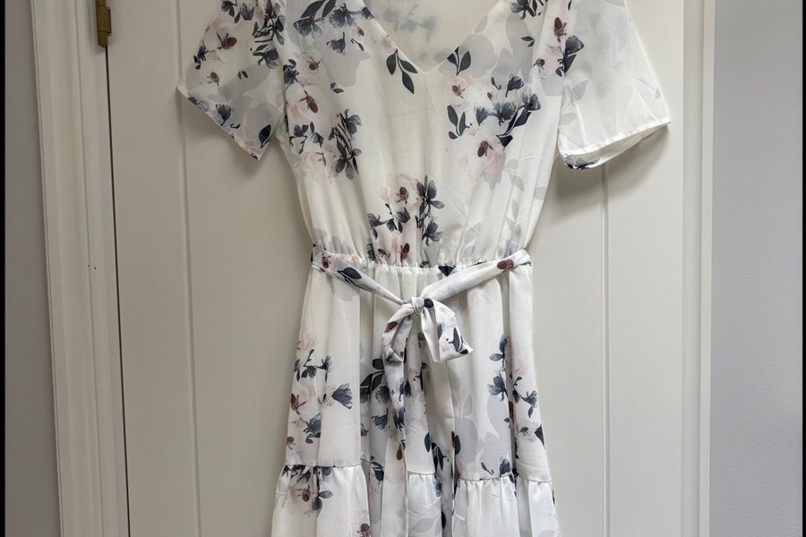 Vit klänning med blommigt mönster i blått, rosa och brunt. Klänningen har korta ärmar och V-ringning. Midjan är markerad med ett knytband i samma tyg och mönster som klänningen. Kjoldelen har volanger.