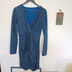Blå klänning med långa ärmar och knytskärp o fickor, velourtyg, strl M