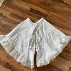 Vit blus i sekelskiftesstil med hög krage och långa, vida ärmar. Blusen har ett rutigt mönster i en ljusgrön nyans. Lite kortare modell för att passa till en högmidjad kjol som var populärt under sekelskiftet.