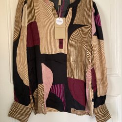 Långärmad blus med ett blommigt mönster i olika färger. Blusen har en v-ringning med knappar framtill.