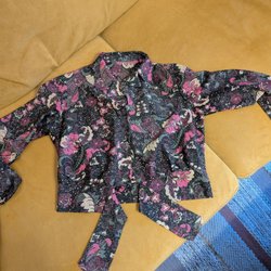 Blommig blus med korta ärmar och rynkad halsringning. Blusen har ett knytband i midjan för att framhäva figuren.