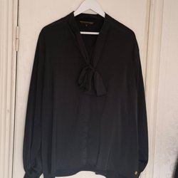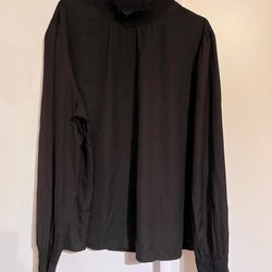 Svart blus med fyrkantig halsringning och långa puffärmar. Blusen har en smockad överdel och en utsvängd nederkant.