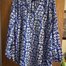 Blus/kavaj med långa ärmar och ett blommigt mönster. Blusen har en krage och knappar framtill. Storlekslapp bortklippt.