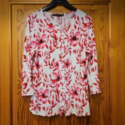 En rosa blus med vitt fågelmönster. Blusen har en V-ringning och korta ärmar. Den är i en lätt och luftig kvalitet.