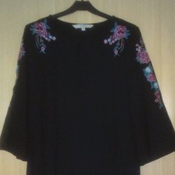 Svart bomberjacka med broderade blommor på framsidan. Jackan har långa ärmar och dragkedja fram. Tunt genomskinligt material.