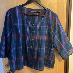 En vacker blus i blått med ett fint mönster. Blusen har en rund halsringning och är lite vid i modellen. Den har även fina detaljer vid ärmsluten. Den är lite genomskinlig så man tänker på det och det syns på bilden. 3/4 dels arm. Katter finns i hemmet. Vill man samfrakta gör jag det. Står ej för postens slarv. Vill man vänta på lön barnbidrag pension säg till.