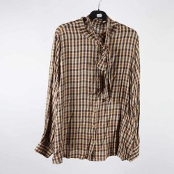 Långärmad blus med ett mönster i rött och blått. Blusen har knytband i halsen och dekorativa tofsar.