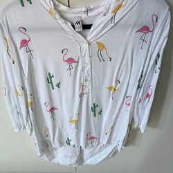 Röd och vit blus med ett blommigt mönster och volangdetaljer framtill. Blusen har korta ärmar med resår och knäppning i nacken.