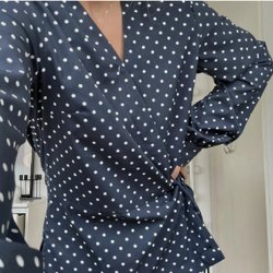 Ljusblå blus med mönster och silverfärgade detaljer. Blusen har långa ärmar och knyts i midjan.