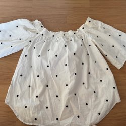 Off-shoulder bluse med lange ærmer og flæsedetaljer. Blusen har en elastisk kant foroven og ved ærmerne.