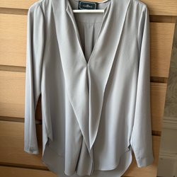 Grå, långärmad blus med krage och knappar framtill. Blusen har en avslappnad passform och en rundad nederkant. Storleken motsvarar L