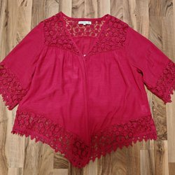 Rosa blus med spets och volanger i en snygg och generöst rymlig modell.