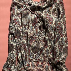 Mönstrad blus med lång ärm i krinkligt tyg. Blusen har ett unikt tryck med olika mönster i svart, beige och vita nyanser med små paljetter. Hittar ingen storlek men uppskattar till L.