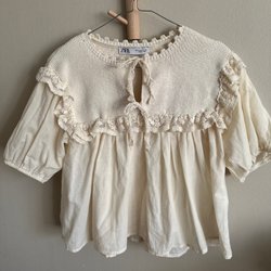 Vit kortärmad blus med krage och dekorativa detaljer på ärmarna. Blusen har en liten öppning baktill.